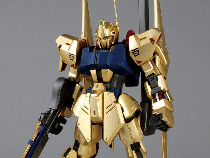 Created to celebrate the 30th anniversary of the Zeta Gundam TV series and complete the Gundam Team trio of the Zeta Gundam and Gundam MK II, the Hyaku-Shiki re-appears in the MG line! Featuring a slimmer profile with stylish new proportion, it contains under-gated parts to reduce appearance of visible cut marks and a special finish over the plastic to replicate its fantastic gold appearance! The vestigial transformation in the legs and wings has been included to provide accuracy to its involvement in the abandoned transformable Delta Gundam project. Different sensor parts in the eyes are included to replicate neutral, activation, and scanning sensor appearance.