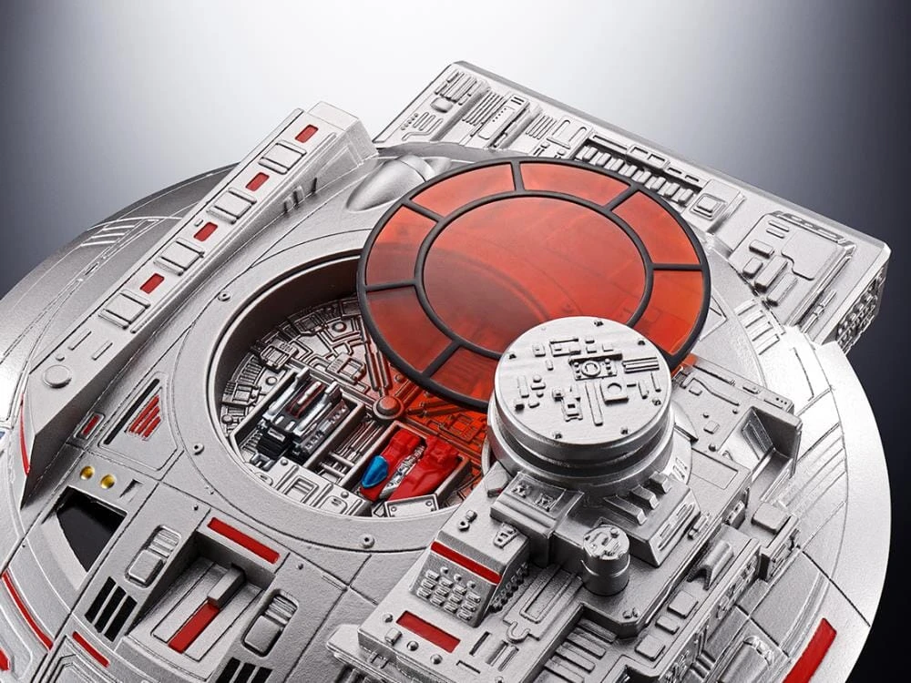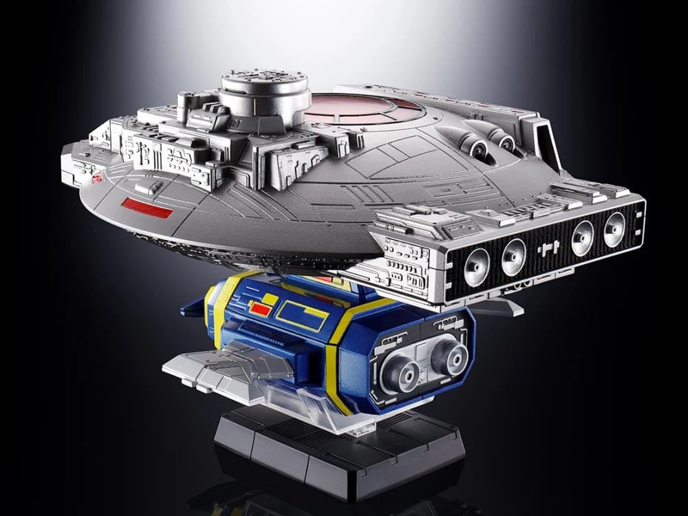 From SPACE SHERIFF GAVAN comes the mighty Denshi Seijyu Dol, who joins Soul of Chogokin as a fully transforming toy! The set also includes the Guillan Enban that serves as Gavan’s mobile base of operations. The pair can be docked together to replicate dramatic launch scenes from the series including playback of the theme song from an embedded chip! Three enemy saucers are included as accessories